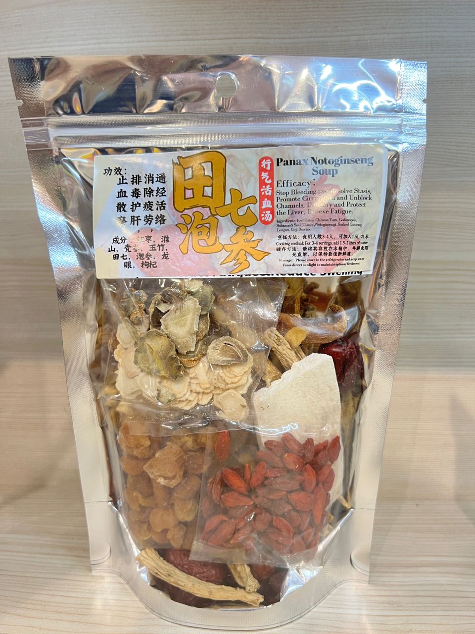 Ingredients: Ingredients: Red Dates, Chinese Yam, Codonopsis, Solomon’s Seal, Tianqi (Notoginseng), Soaked Ginseng, Longan, Goji Berries.