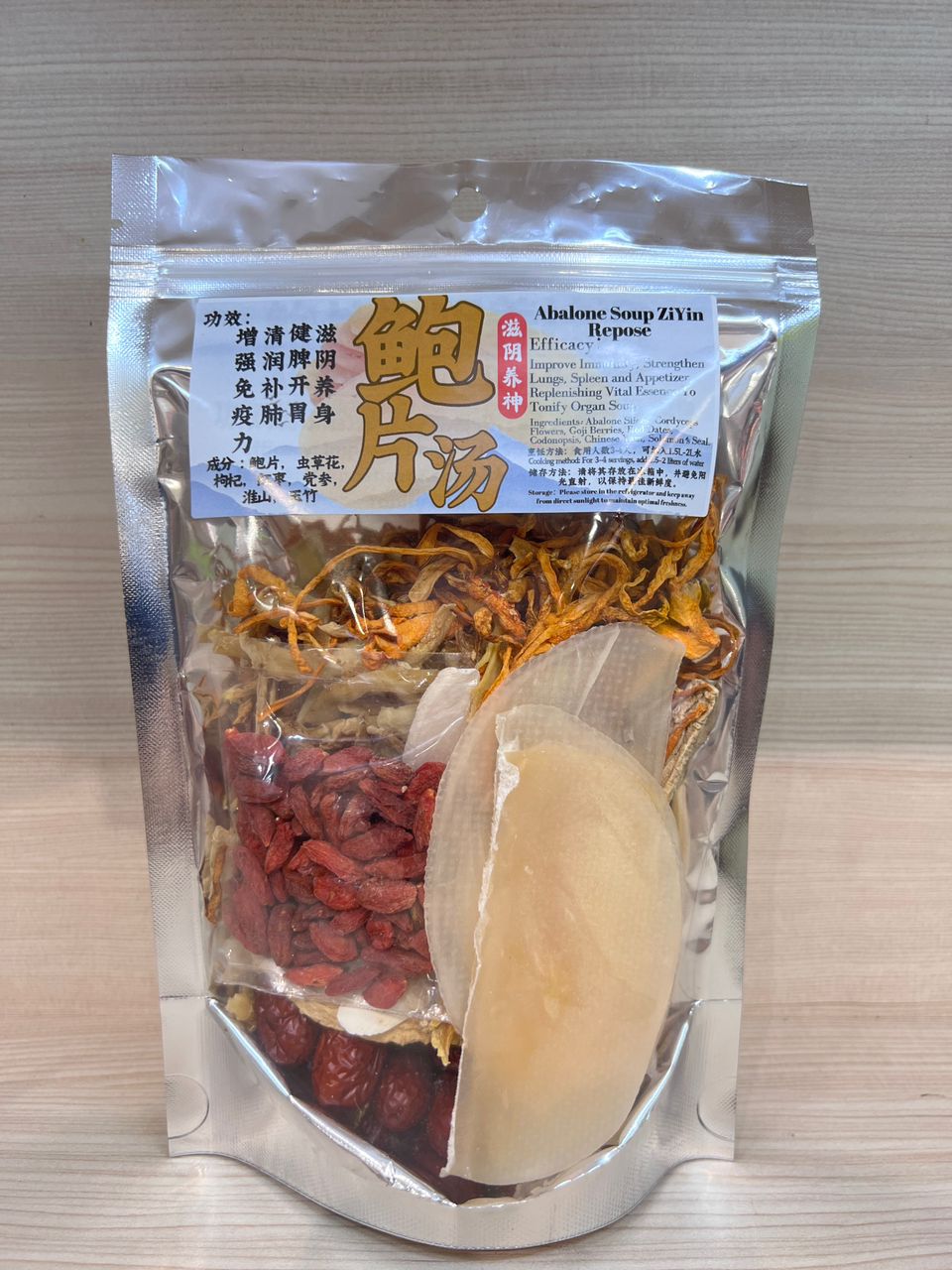 Ingredients: Abalone Slices, Cordyceps Flowers, Goji Berries, Red Dates, Codonopsis, Chinese Yam, Solomon’s Seal.